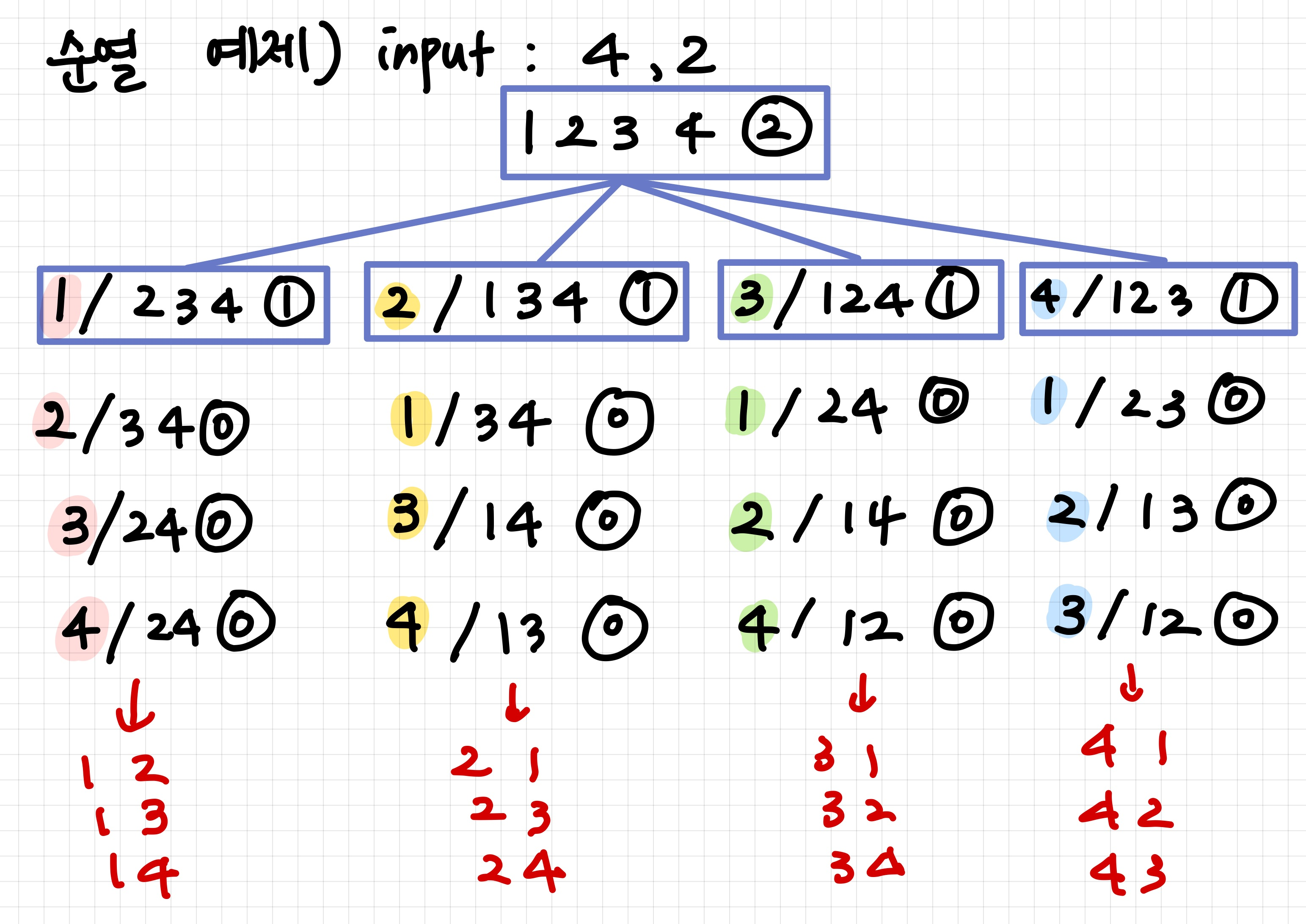 permutation([], [1, 2, 3, 4], 2) = permutation([1], [2, 3, 4], 1) + permutation([2], [1, 3, 4], 1) + permutation([3], [1, 2, 4], 1) + permutation([4], [1, 2, 3], 1) 이다.