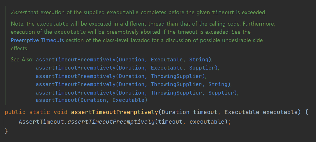 assertTimeoutPreemptively :주어진 시간동안 테스트가 끝나지 않으면 테스트를 실패 시키는 메소드