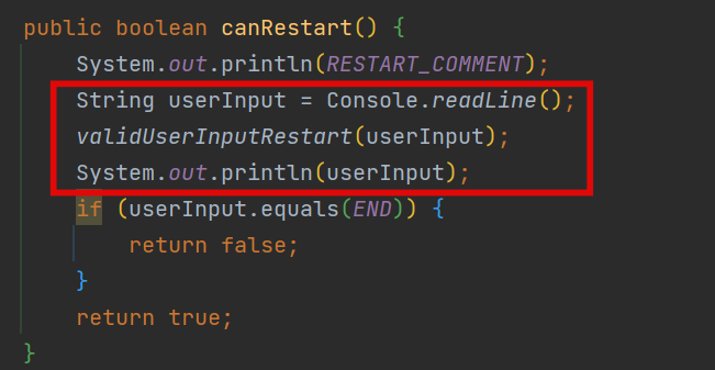 conRestart 메서드에서도 사용자 입력 관련된 부분이 있어서 위의 사례와 같은 이유로 사용자 입력 관련된 부분은 InputNumbers 클래스로 옮겨주었다.