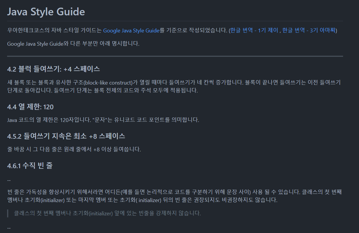처음에는 자바 코드 컨벤션 가이드를 다 지켜야 한다는 압박감이 있었다.(나 혼자만의...)