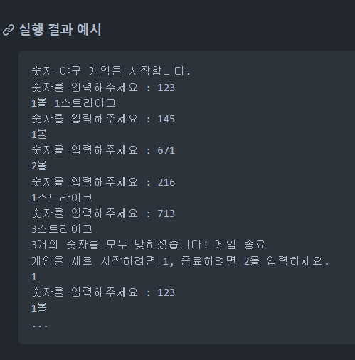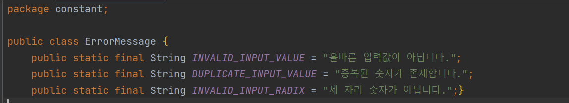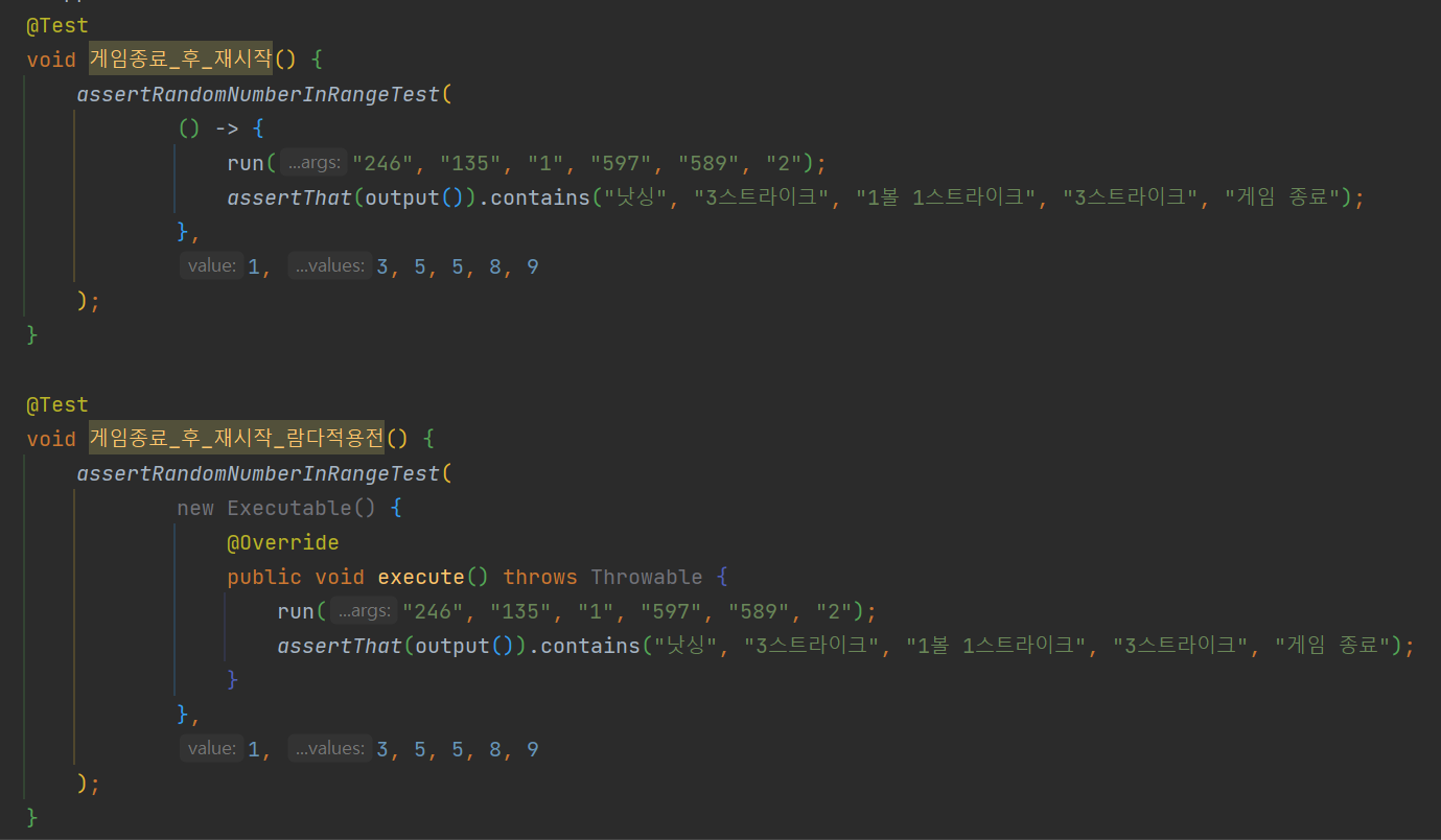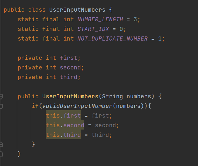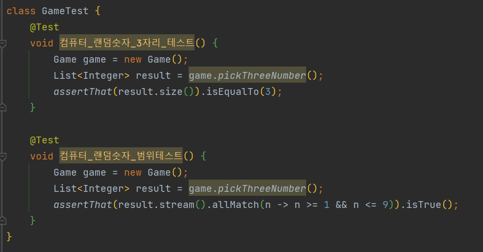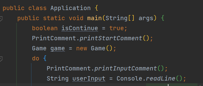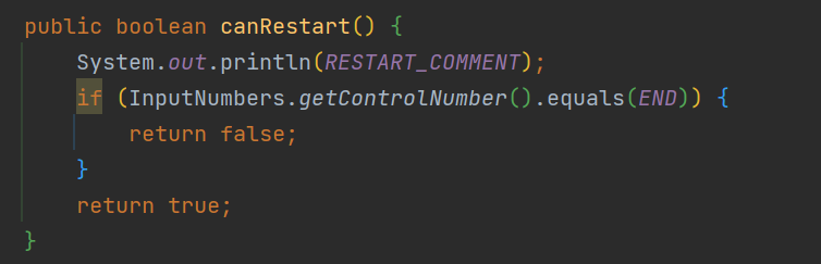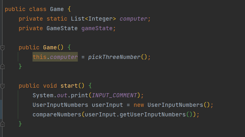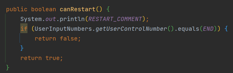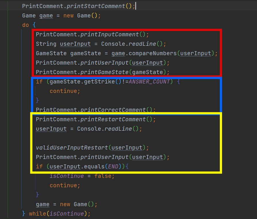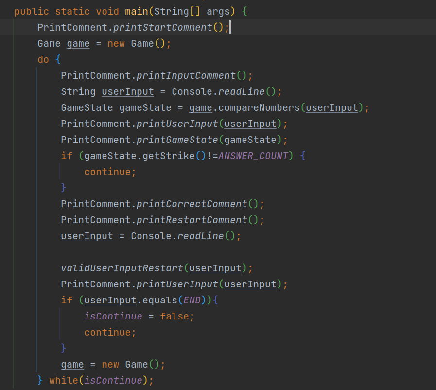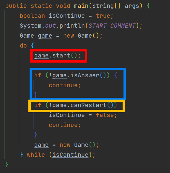 이렇게 메서드로 만듦으로써 main 메서드에서는 게임 시작, 정답 확인, 재시작 가능 여부를 확인만 하면 되고, 나머지는 Game 클래스안의 메서드에서 처리할 수 있게 되었다.
