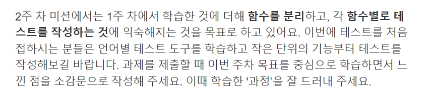 2주차는 아래의 메일 본문 내용의 일부에 나와있듯이, 함수를 분리하고, 함수별로 테스트를 작성하는 것에 익숙해지는 것이 목표였다.