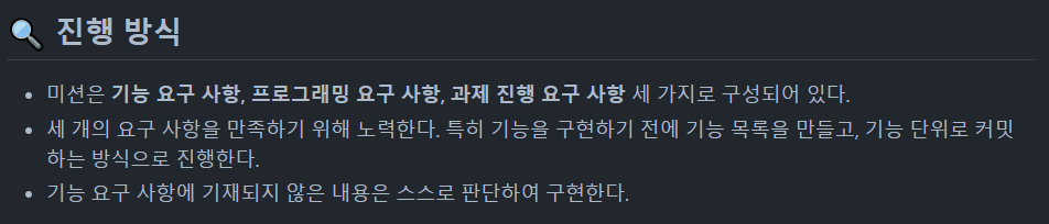 지난주와 동일하게 진행방식은 기능요구사항, 프로그래밍 요구사항, 과제 요구사항을 다 구현하는 것이었다.