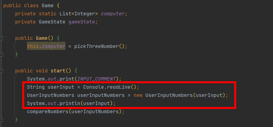 Game의 start메서드 안에는 사용자의 입력에 관한 부분이 있다.