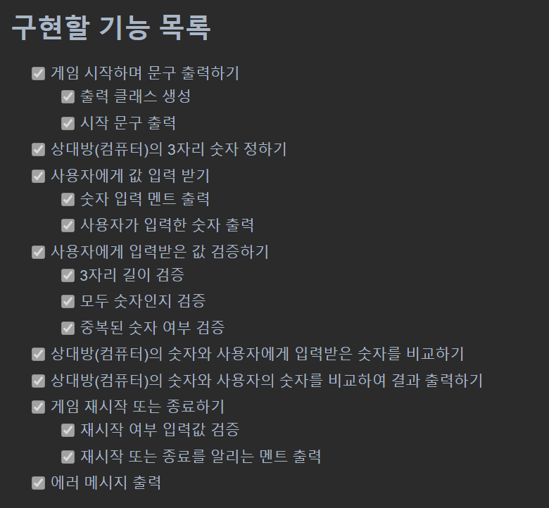 기능을 구현하기 전 기능 목록을 만들고 기능 단위로 커밋을 해야했기에 기능 요구사항을 읽으면서 구현할 기능을 정리했다.