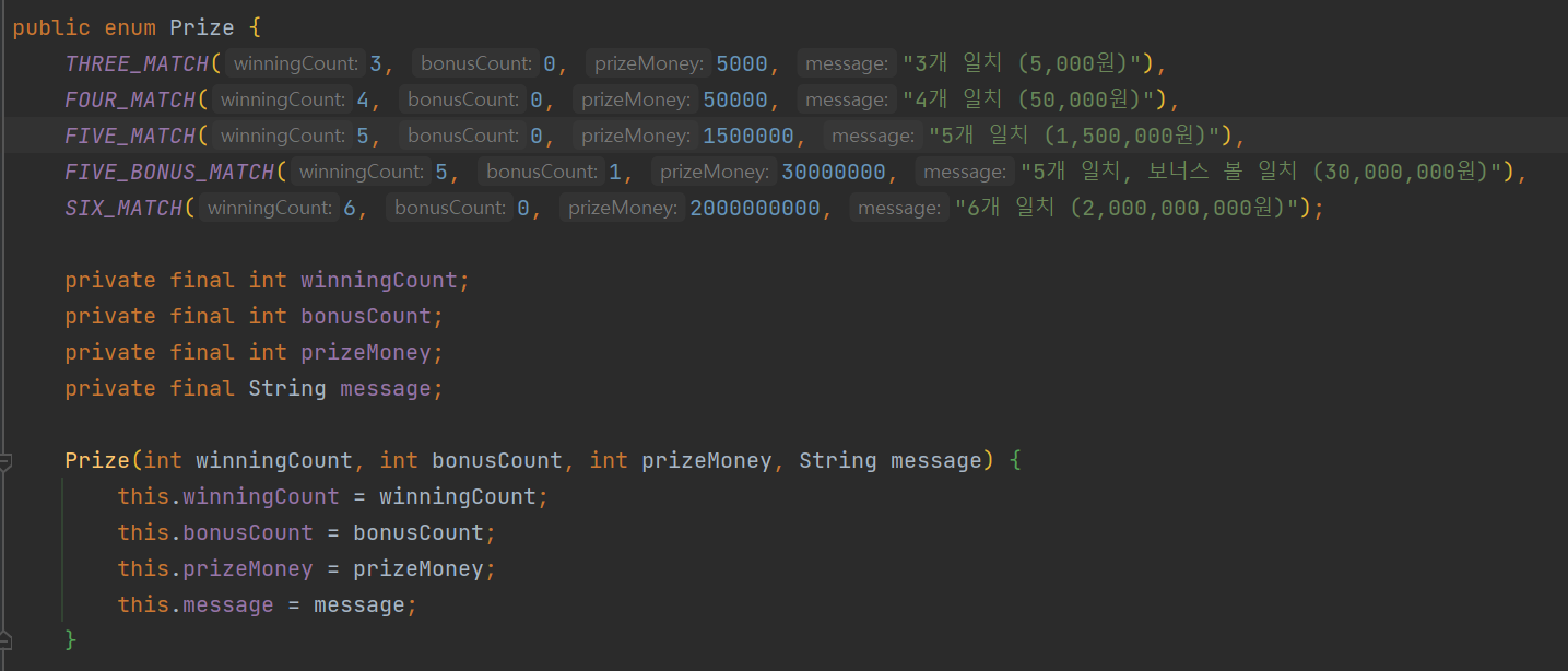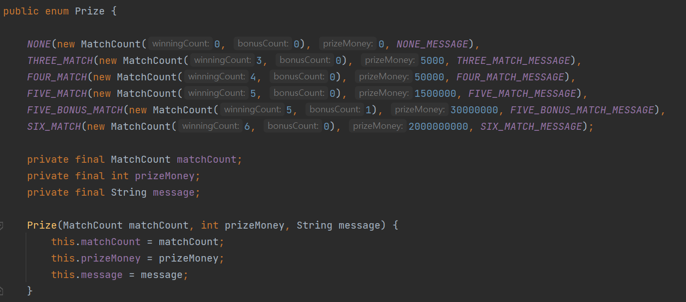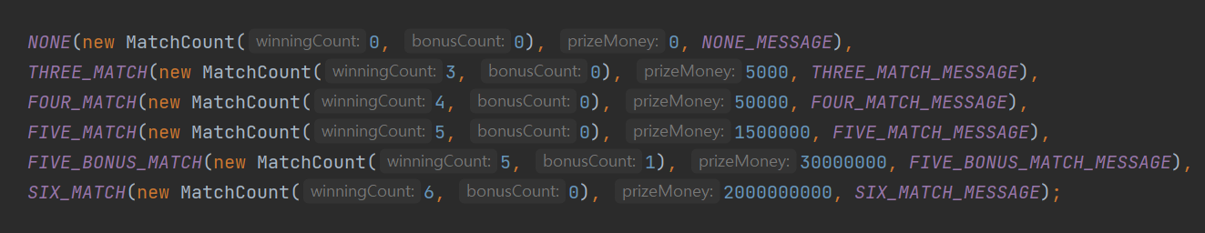Prize enum에는 해당 등수에 맞는 MatchCount가 저장되어 있다.