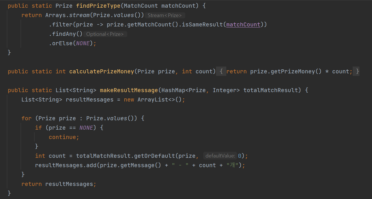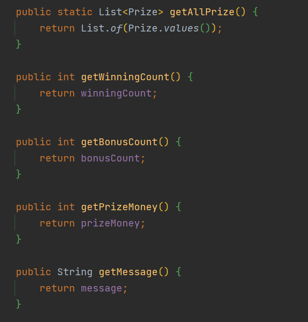 이렇게 코드를 다 작성한 후 살펴보니, Prize enum의 자율성이 떨어지는 것처럼 보였다.