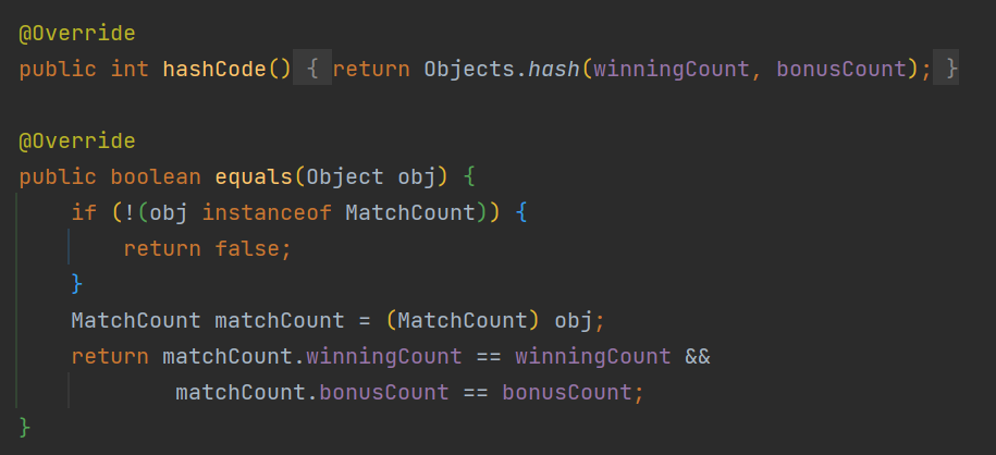 MatchCount는 객체이기 때문에 equals로 비교하면 같은 결과가 나오지 않는 다는 것을 간과했다.