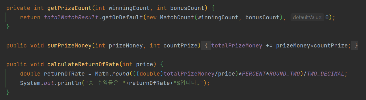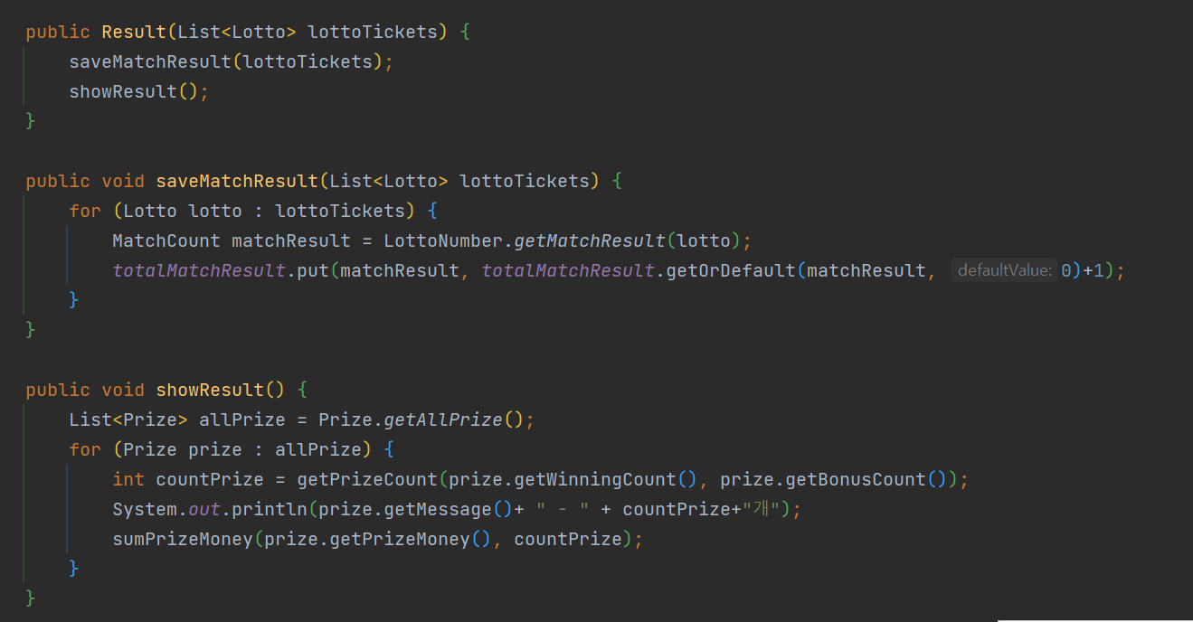 Result 클래스에서는 Prize 내부에서 처리한 값을 가지고 구현하도록 했다.