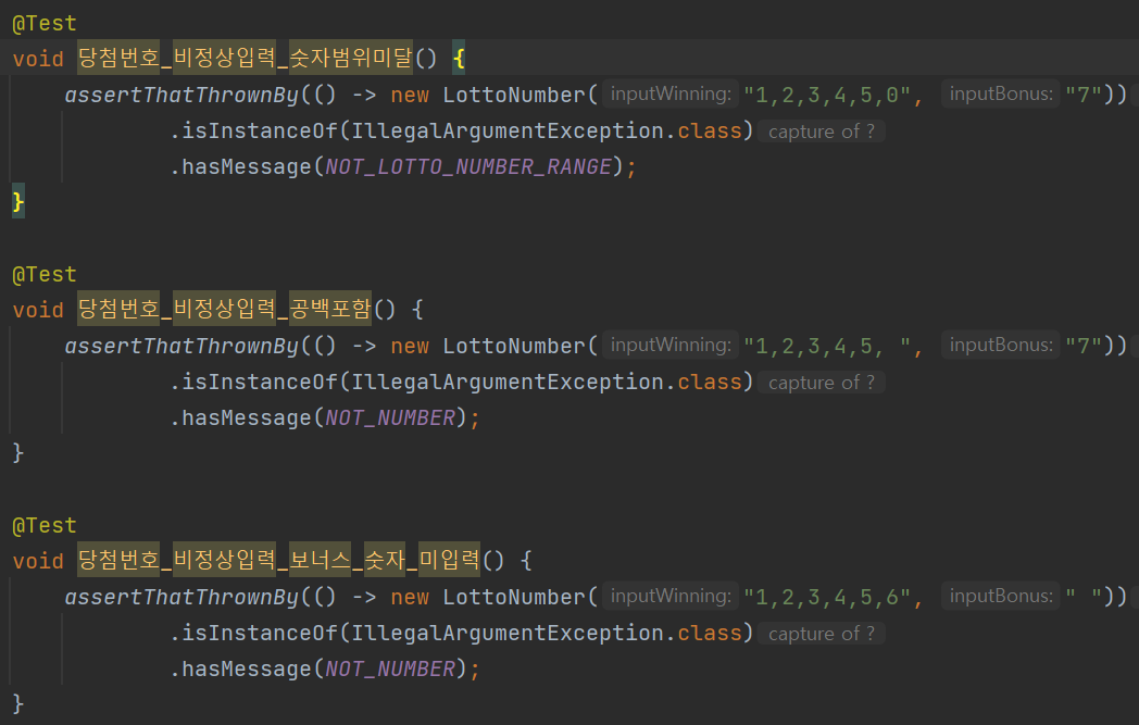 처음에 비정상 입력을 이렇게 다 다르게 해서 테스트 코드를 작성했지만,