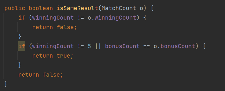 당첨 개수가 같을 때 번호 5개가 일치할 경우만 bonusCount를 따져주면 되므로, 다음과 같이 구현했다.