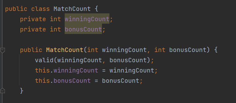 MatchCount 클래스는 다음과 같이 맞은 당첨 번호 개수와 보너스 번호 개수로 구성되어 있다.