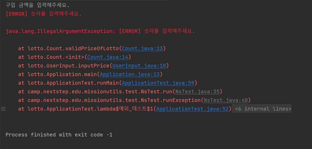 사용자가 잘못된 값을 입력할 경우 IllegalArgumentException을 발생시키고, "[ERROR]"로 시작하는 에러 메시지를 출력 후 종료한다.