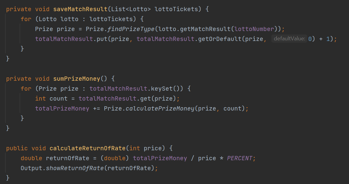 그리고 Result클래스에서 처리하던 로직들을 Prize 내부에서 처리하도록 메서드를 이동시켜주었다.