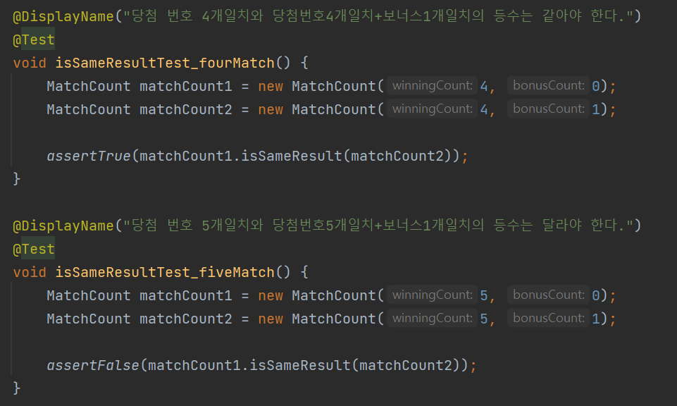 equals로 비교하다며니 당첨 개수가 3개, 보너스 개수가 0개인 것만 5등으로 판단하는 것이었다.