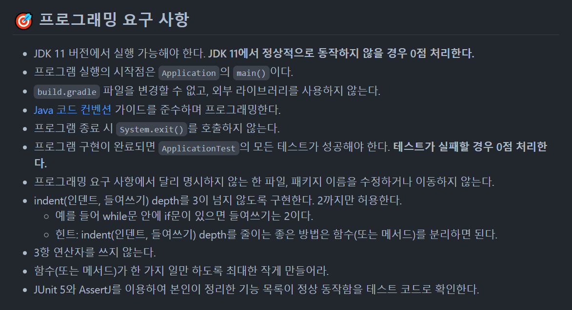 벌써 프리코스의 마지막 미션밖에 남지 않았다.