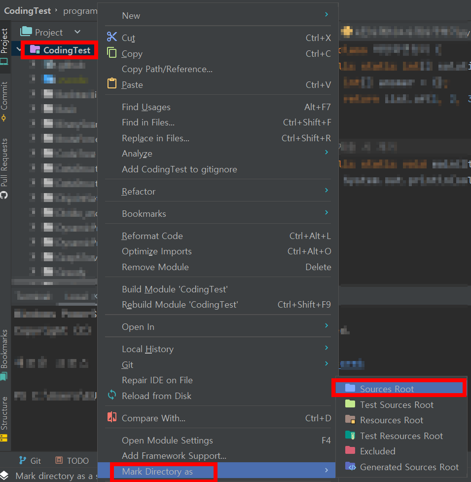 상위의 폴더를 우클릭 -> Mark Diredtory as -> Sources Root 를 클릭하여 프로젝트의 루트로 지정해주면 해결할 수 있다.