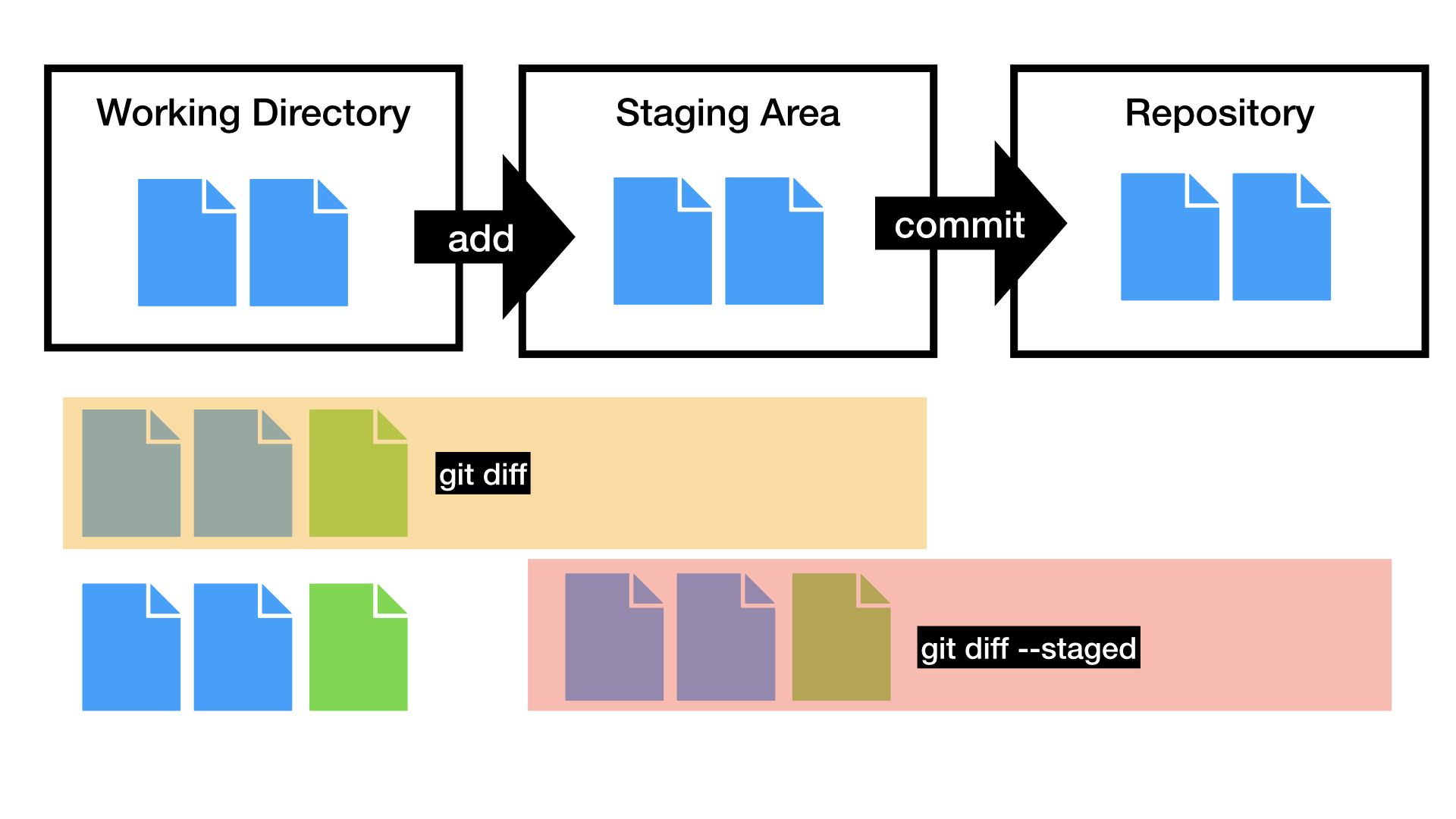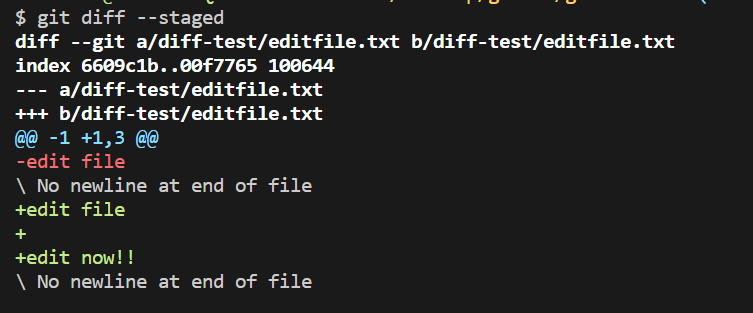 따라서 git add를 한 다음에 git diff 명령어를 쓰면 이미 수정된 사항이 Staging area에 들어가서 아무런 변경 사항이 나오지 않는 것이다.