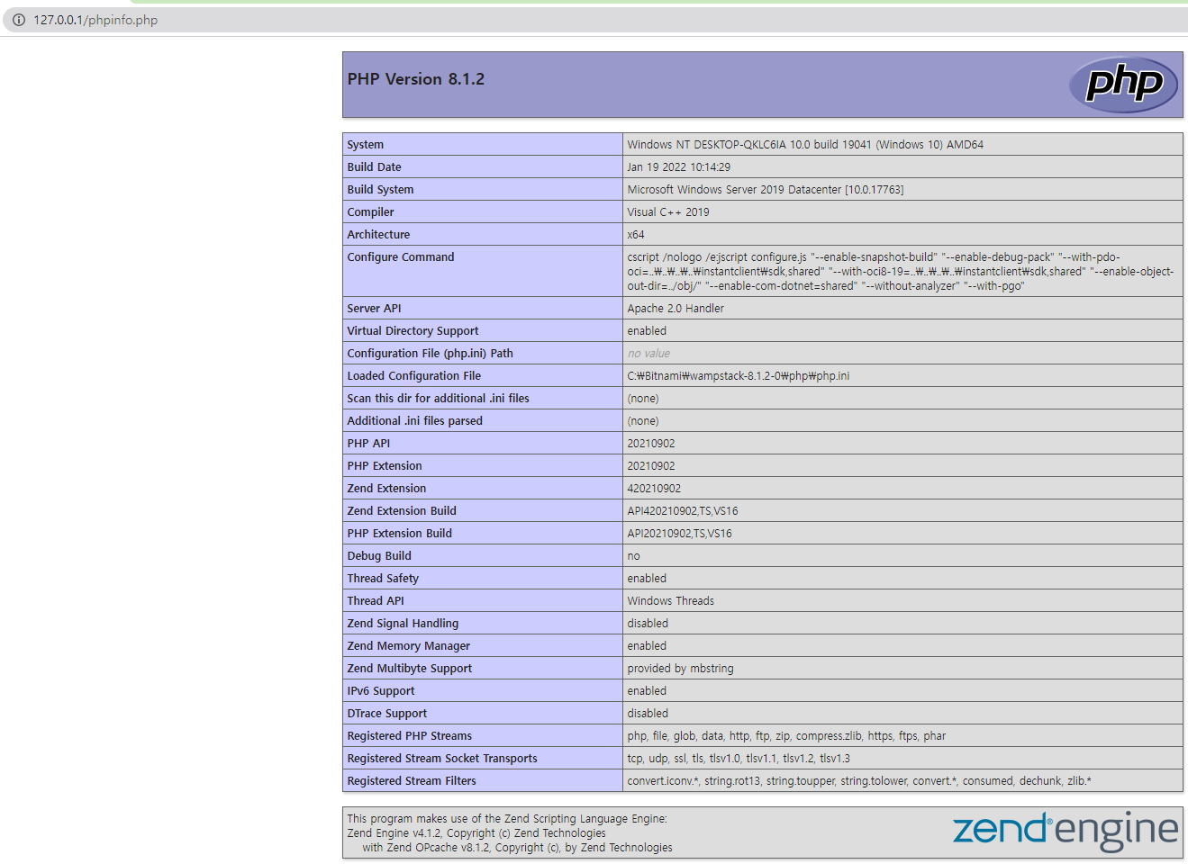 127.0.0.1/phpinfo.php 를 입력하여 다음과 같은 화면이 나오면 성공한 것이다.