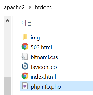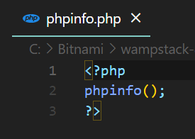 C:\Bitnami\wampstack-8.1.2-0\apache2\htdocs에 phpinfo.php 을 새로 생성한 뒤 다음과 같이 작성한다.