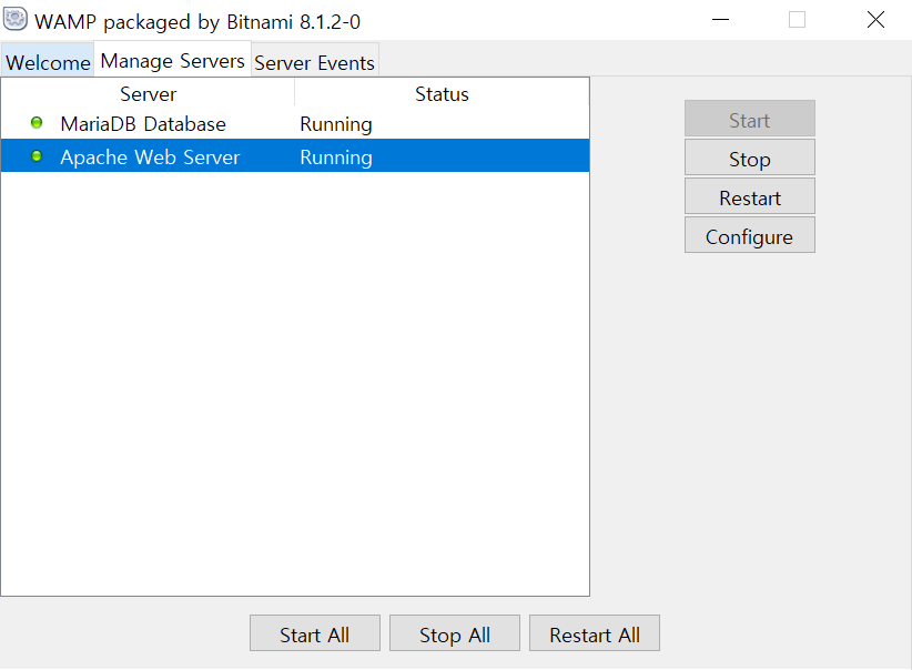 MariaDB Database와 Apache Web Server의 상태가 running인지 확인한다. 만약 Running 상태가 아니라면 Start를 클릭한다.