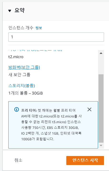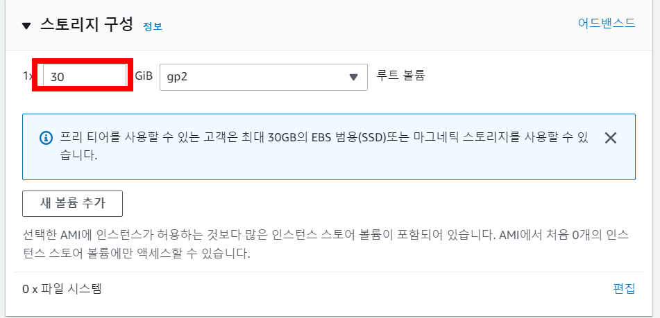 - 프리티어 사용 가능 고객은 최대 30GB의 스토리지를 사용할 수 있으므로 크기를 30GB로 해주었다.