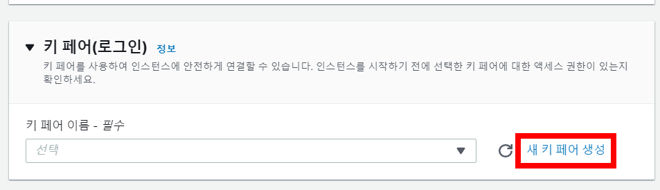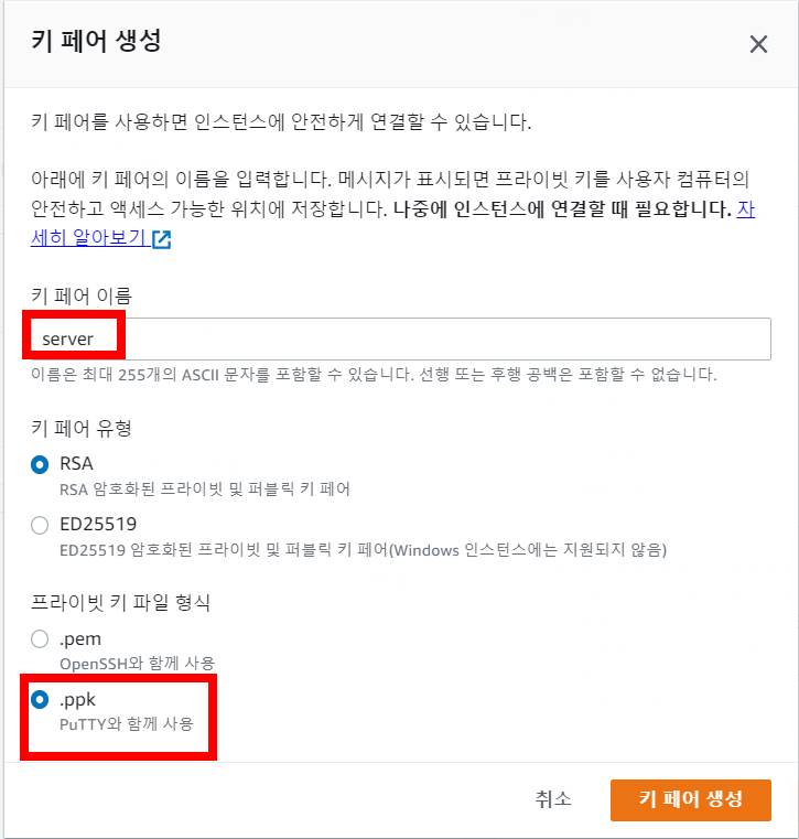 7. 새 키 페어 생성을 선택하고 이름을 입력한 후 .ppk 확장자를 선택하고 키 페어 생성을 클릭한다.