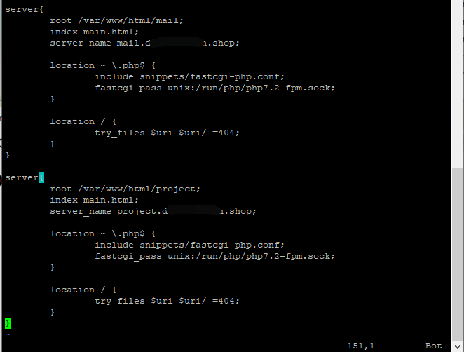 - 위의 server블록이 mail 서브 도메인, 밑의 server블록이 project 서브 도메인
