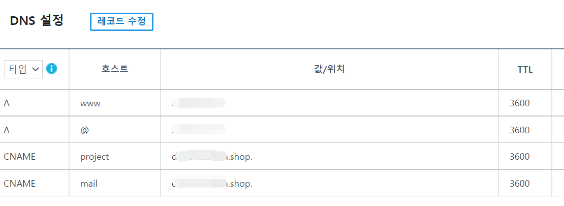 - 타입 : CNAME(CNAME 레코드는 도메인에 별칭 이름을 연결하는 DNS 레코드 유형)