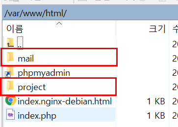 - /var/www/html(Nginx의 기본 경로(루트 디렉터리))에 설정한 서브 도메인 이름으로 디렉토리 생성 (나의 경우 project, mail)