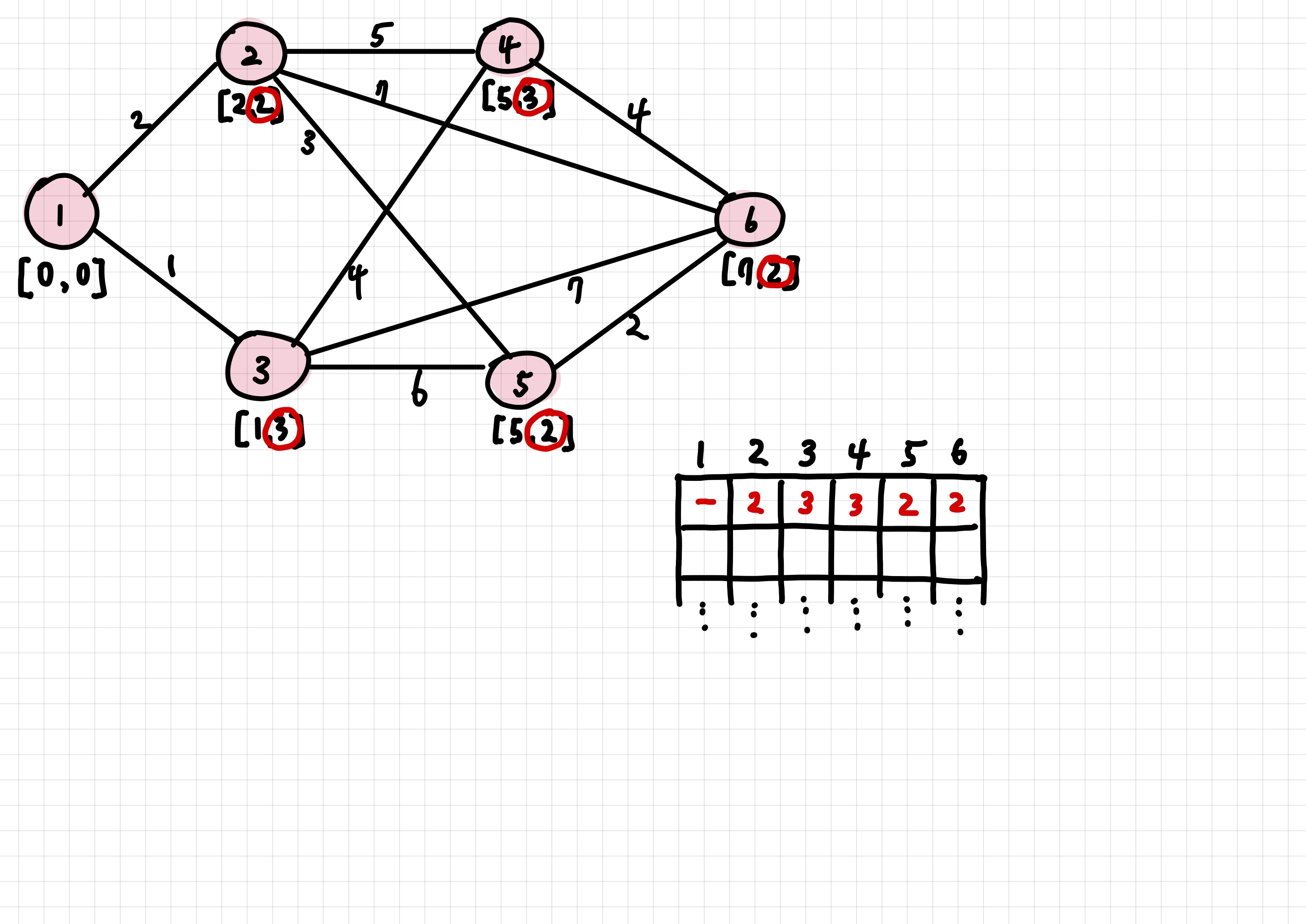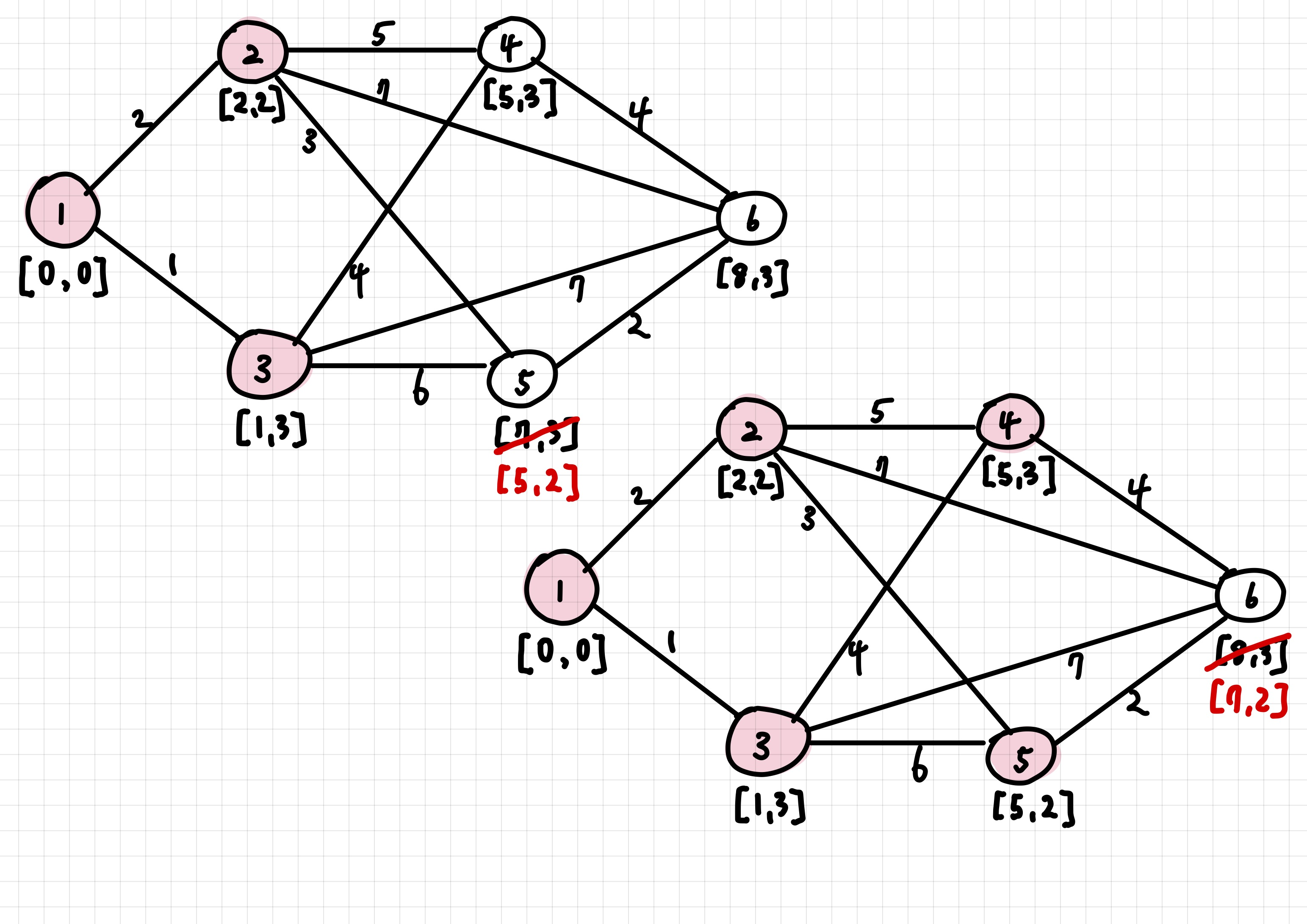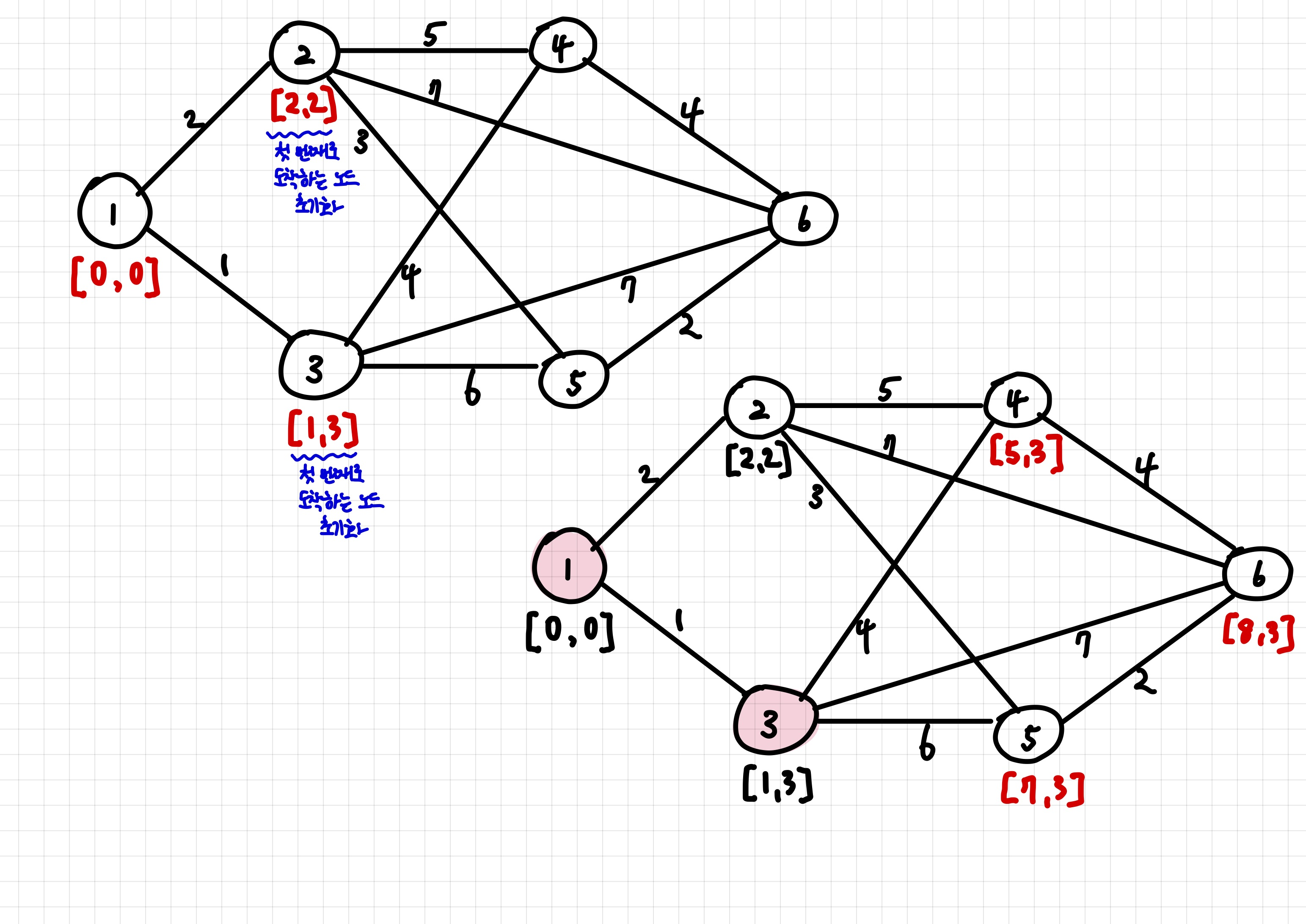 아래의 그림은 1번 노드에서 최단경로로 화물을 이동시키기 위해 가장 먼저 거쳐야 하는 집하장을 구하는 과정이다.