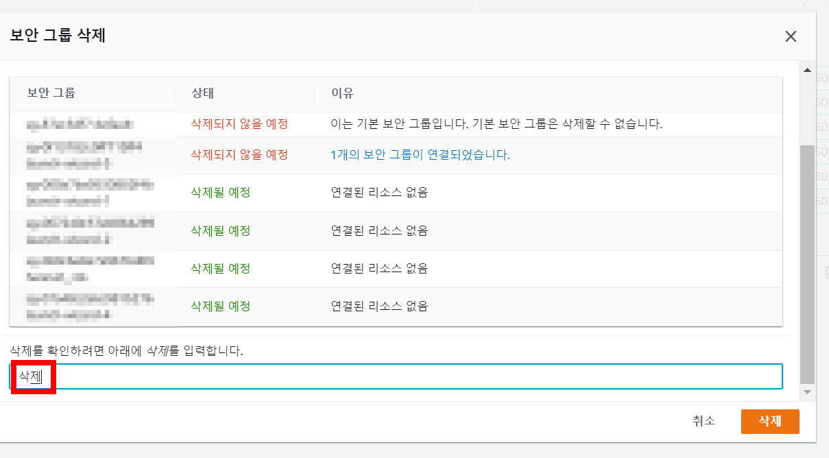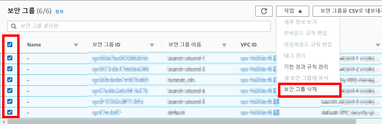 1. 삭제할 보안 그룹을 선택한다. 작업>보안 그룹삭제를 누른다.