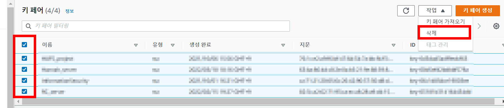 1. 삭제할 키페어를 선택한다. 작업>삭제를 누른다.