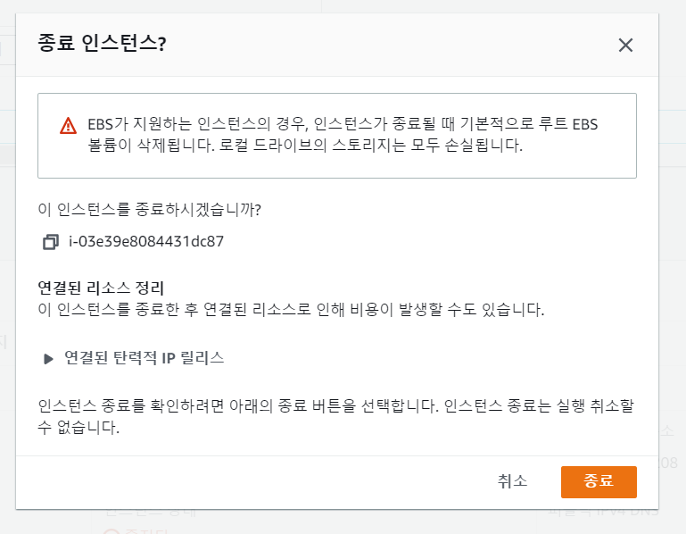나의 경우에는 탄력적 IP도 연결되어 있었기 때문에 탄력적 IP도 없애주어야 한다.