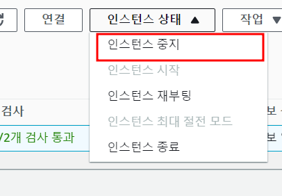 "인스턴스 중지"를 누르고 일정 시간이 지면 중지됨이라고 뜬다.